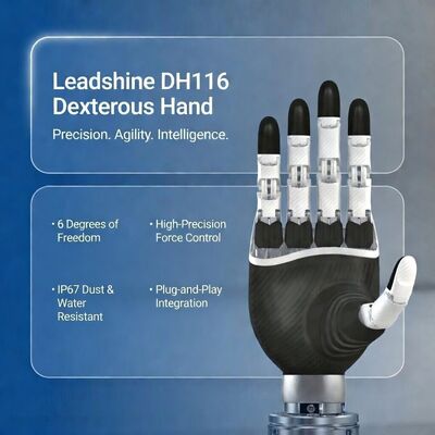 The Leadshine DH116 is a 5-finger dexterous robotic hand from the DH series. It features 6 active degrees of freedom + 5 passive, brushless coreless motors, planetary reducers, and hybrid force-position control. Designed for collaborative robots, humanoid hands and research/education platforms, it offers strong load capacity and perception at a competitive price point.
